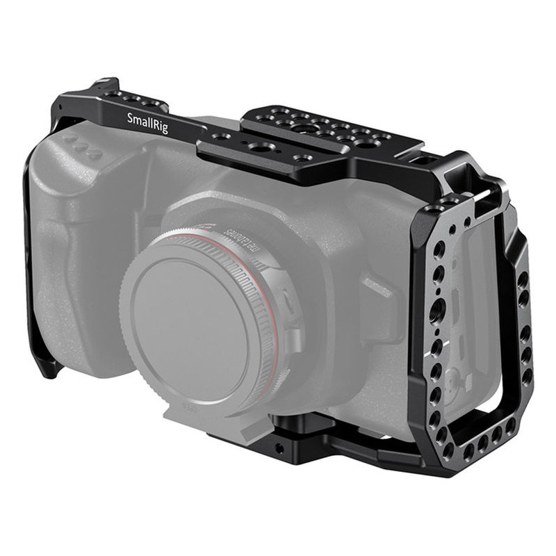 Full protective cage designed specifically for Blackmagic Pocket Cinema 6K and 4K cameras, Multiple mounting points including 1/4″-20, 3/8″-16, and ARRI-style accessory threads on the top and sides, enabling versatile attachment of handles, lights, microphones, or other filmmaking gear. Maintains full access to camera controls, SD cards, battery compartments, and connectors when the cage is attached, Secured fit using 1/4″-20 screws on top and bottom with additional locating pins and rubber pads to prevent movement or wobble.